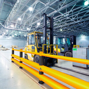 Barriera pedonale ideale per delimitare le aree del magazzino ad altissimo traffico di muletti con carichi pesanti. Adatta per uso interno ed esterno.